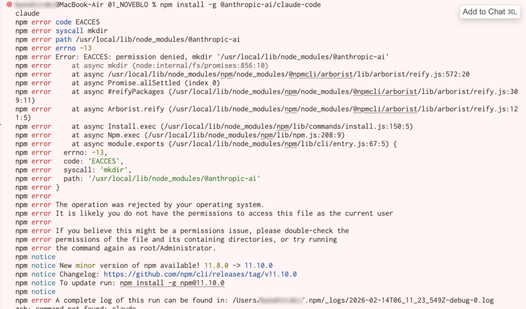 チャッピー曰く、Macではよくある権限問題らしい。