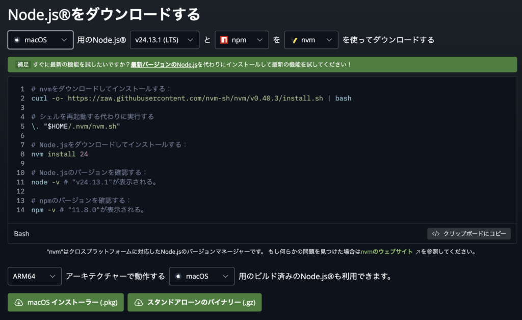 公式サイト(https://nodejs.org/ja/download)から、「macOS インストーラー (.pkg)」を選んでPCにダウンロード。
