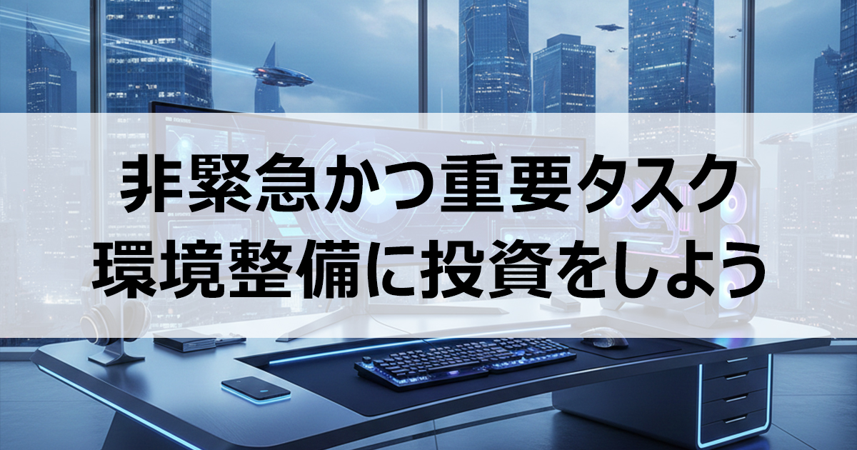 これはAIに限った話ではない。オフィスの掃除やデスクトップの整理整頓も含まれる。ただこれらは「重要だが緊急ではない」タスクの代表格であり、直接的な利益や成果物を生み出すわけではない。そのため、日々の忙しさに追われていると、やった方がいいとは思いつつどうしても後回しにしがちである。