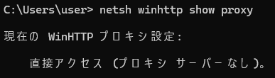 コマンドプロンプトを開いてnetsh winhttp show proxy を確認。